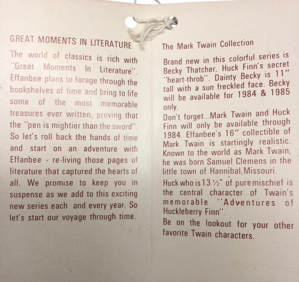 Vintage Effanbee Mark Twain Becky Thatcher Doll is a timeless collectible that brings the adventurous spirit of Mark Twain's classic literature to life. This exquisite doll captures the essence of Becky Thatcher with intricate details and historical charm, making it a must-have for doll enthusiasts and literary fans alike. Crafted with precision, it embodies the nostalgia of vintage toys, perfect for display or play in the world of dolls and collectibles.
