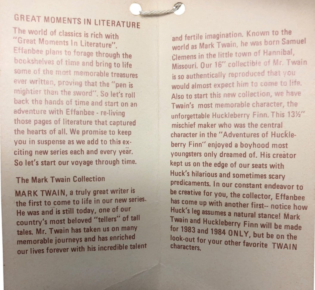 Vintage Huck Finn Effanbee Collector Doll is a timeless treasure for doll enthusiasts and kids alike, capturing the adventurous spirit of Mark Twain's iconic character with exquisite craftsmanship. This collectible doll features intricate details that evoke nostalgia, from its vintage-inspired outfit to lifelike facial expressions, making it a perfect addition to any toys and games collection. Handcrafted with high-quality materials, it brings a piece of literary history to life, appealing to both playtime fun and display-worthy appeal.