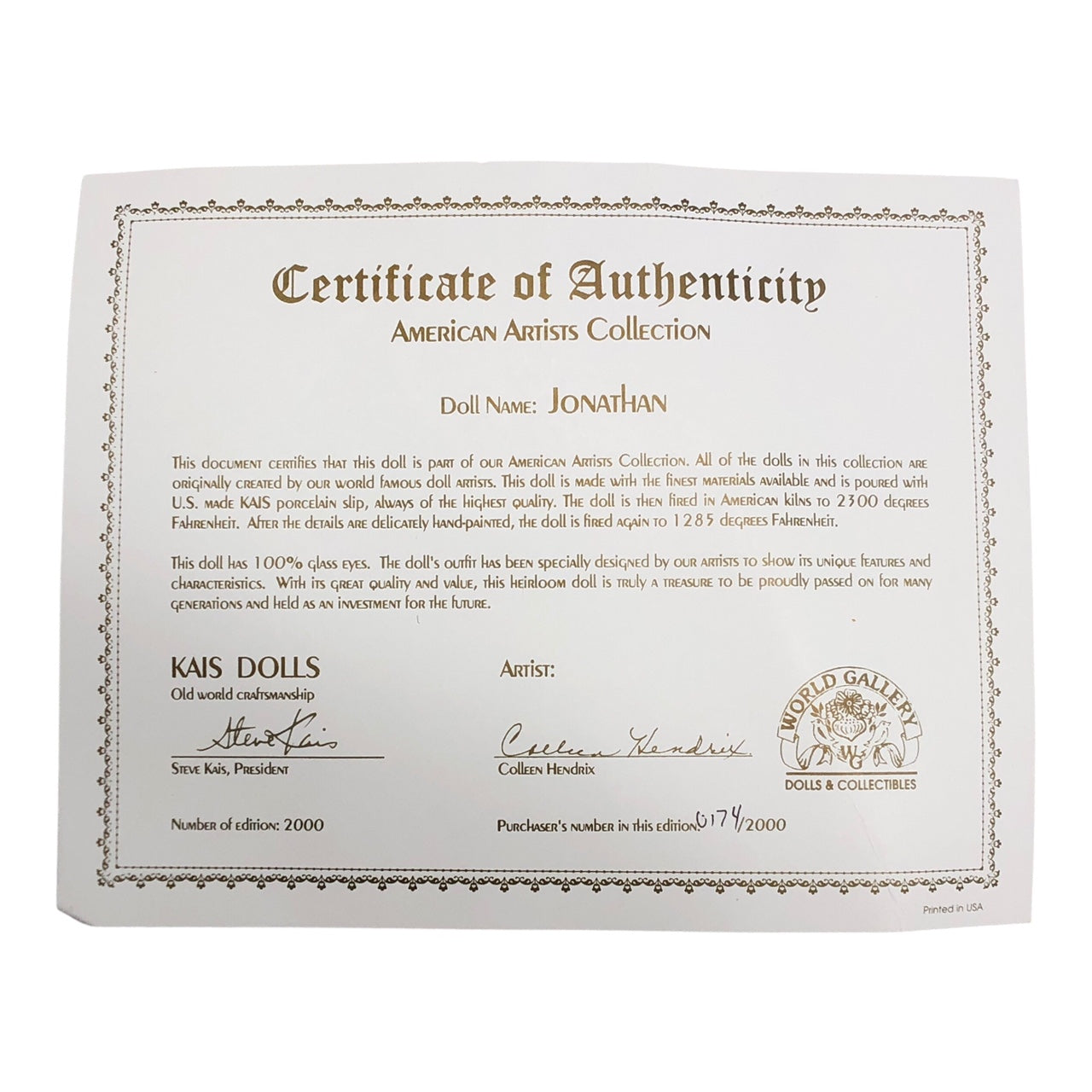 Jonatham Doll By Kais Inc (Porcelain) |Scrolls| is a collectible porcelain doll crafted for display and heirloom collections. This piece arrives with a Certificate Of Authenticity showing its name, limited edition numbering (0174/2000), and production details, highlighting fine porcelain construction, hand-painted features, and 100% glass eyes for realistic depth. Ideal for collectors of dolls and toy figures, the Jonatham Doll blends museum-quality finish with classic playroom charm.